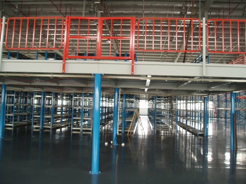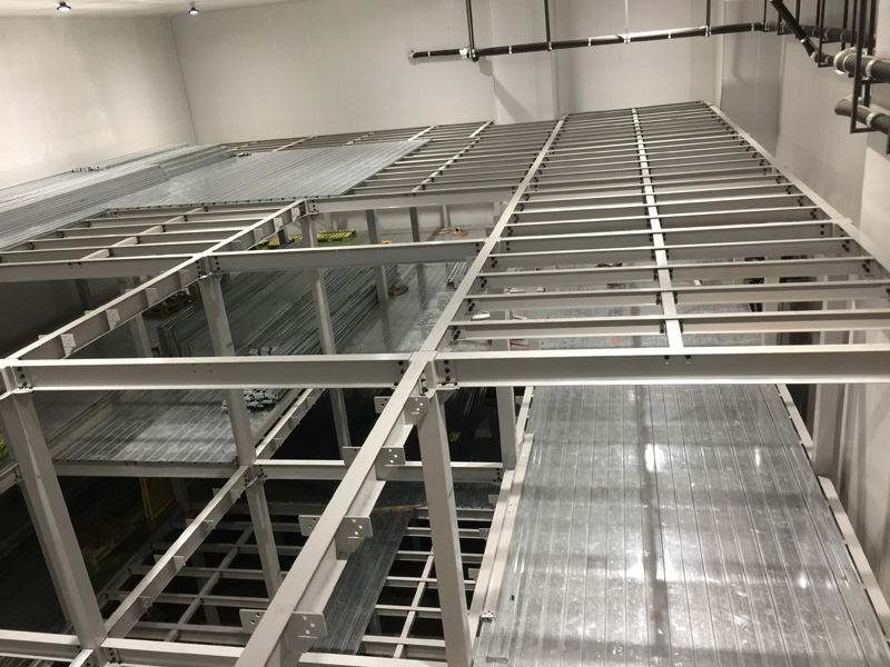 主要由立柱、主梁、次梁、樓面板、樓梯及護欄組成,樓面下方也可根據(jù)需要配置照明系統(tǒng)。貨物輸送可選擇液壓升降平臺、貨梯或叉車。