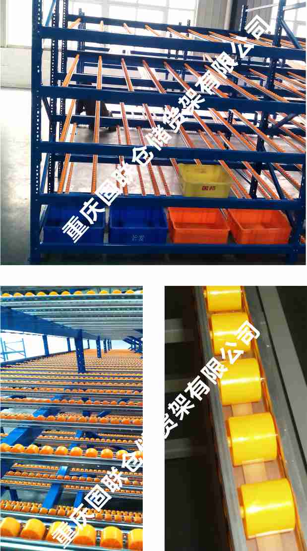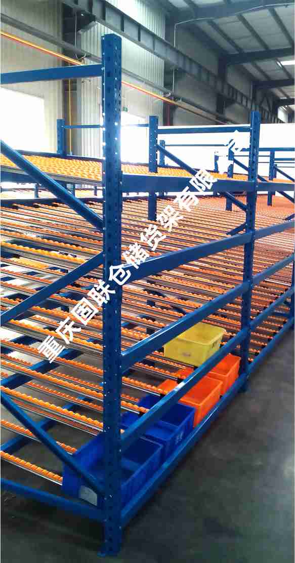 滾輪式料架簡(jiǎn)稱流利架,是將貨物置于滾輪上,利用一邊通道存貨,另一邊通道取貨。料架朝出貨方向向下傾斜,貨物在重力作用下向下滑動(dòng)。可實(shí)現(xiàn)先進(jìn)先出,并可實(shí)現(xiàn)一次補(bǔ)貨,多次揀貨。流利架存儲(chǔ)效率高,適合大量貨物的短期存放。